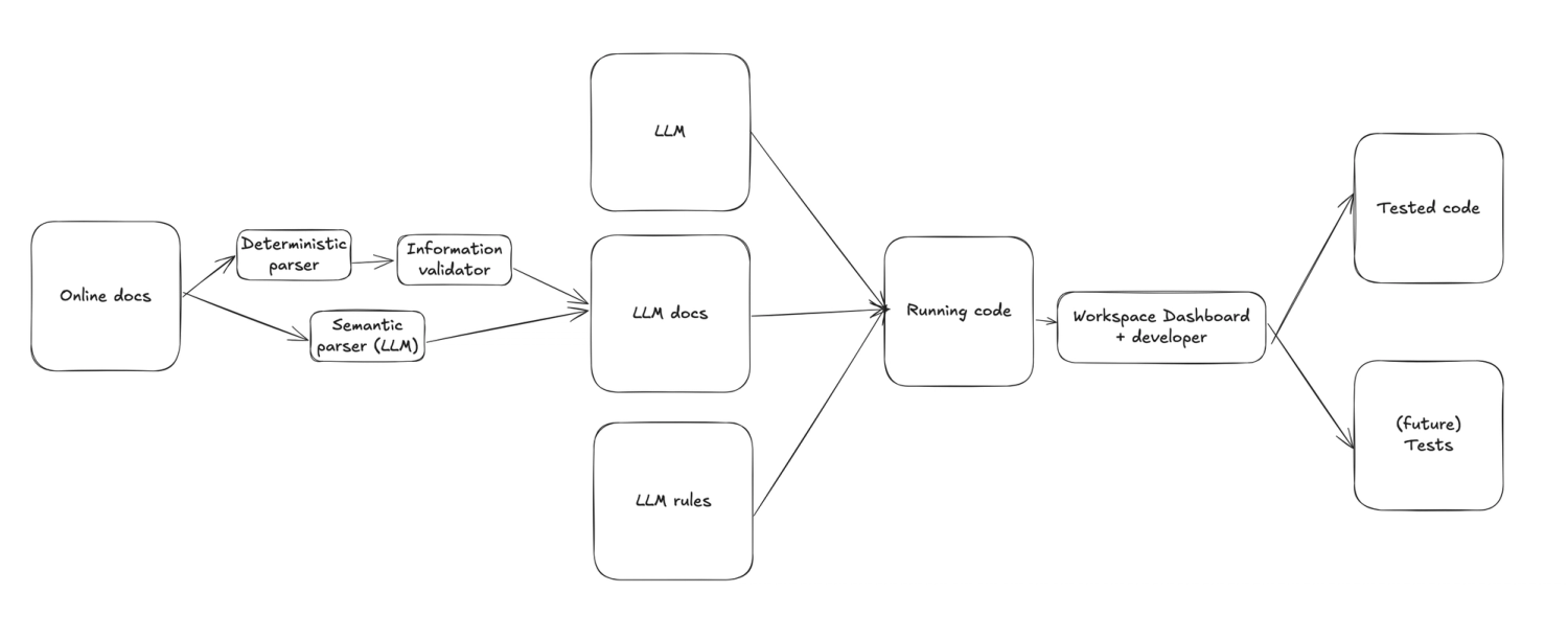 In the above diagram you can see how we use a number of methods to extract and validate information from online docs before giving it to a machine together with more instructions, to generate the code to the level that it runs. Beyond that, validation happens by the human in the workspace app. In the future, users will be able to create tests, run them and later deploy them via this app.