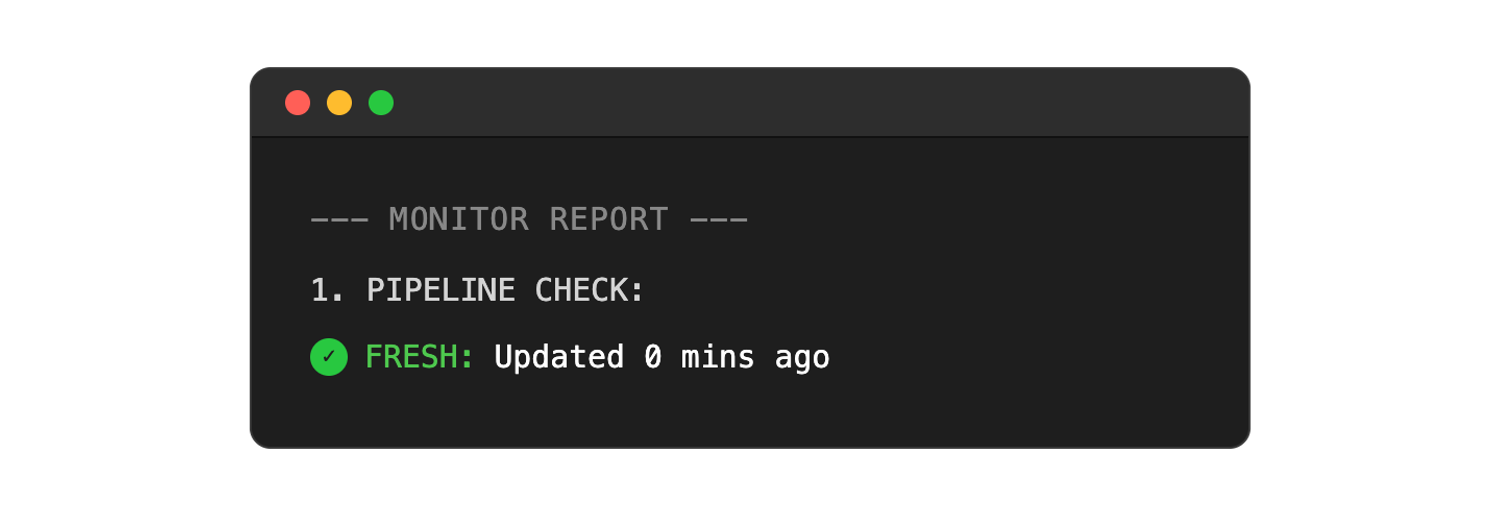 print(f"❌ STALE: Updated {age/3600:.1f} hours ago")Step 2: Load stale data and watch the pipeline check miss it