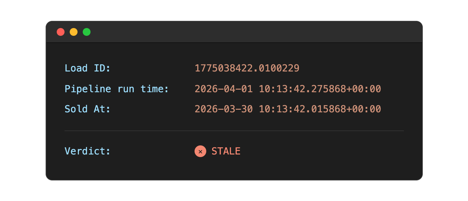 The fix: Use load_id to join _dlt_loads with your source table and compare timestamps. If they're close, the source is fresh. If they're hours apart, the source stopped updating and the pipeline ran green on stale data.