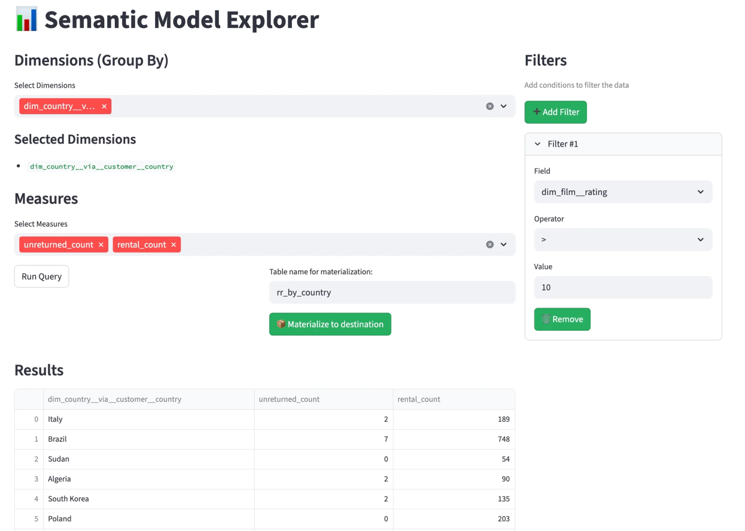 - Streamlit Explorer: A point-and-click interface that lets you select dimensions, measures, and filters to run queries. It can also materialize results back to the warehouse.