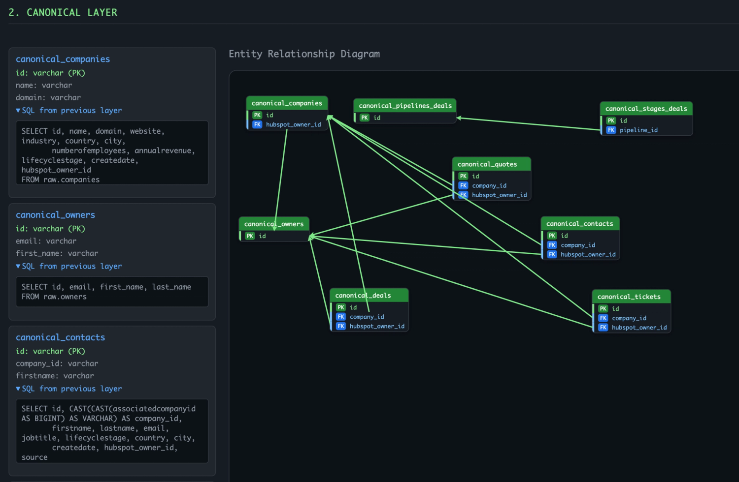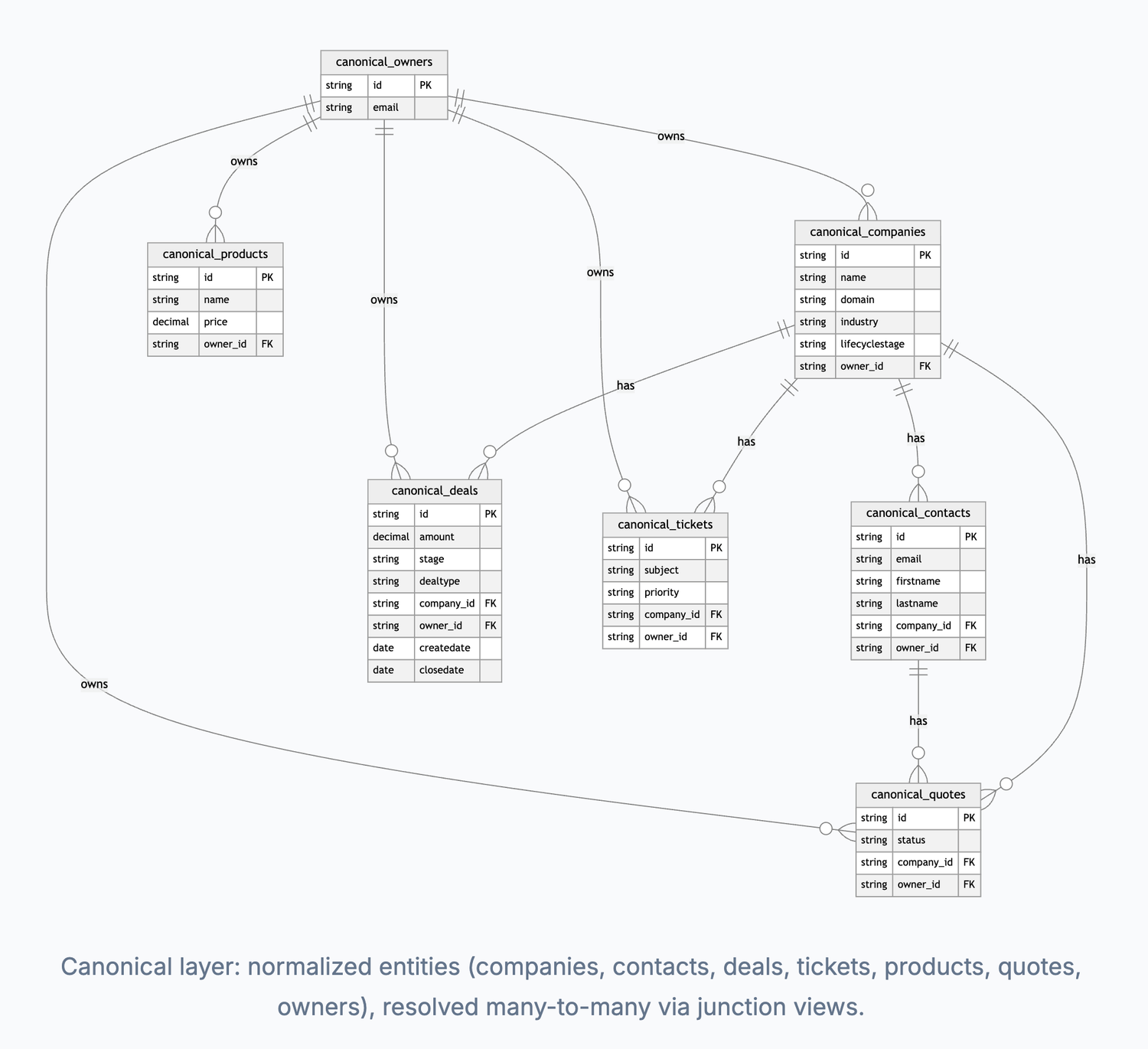 Canonical layer: normalized entities (companies, contacts, deals, tickets, products, quotes, owners), resolved many-to-many via junction views.