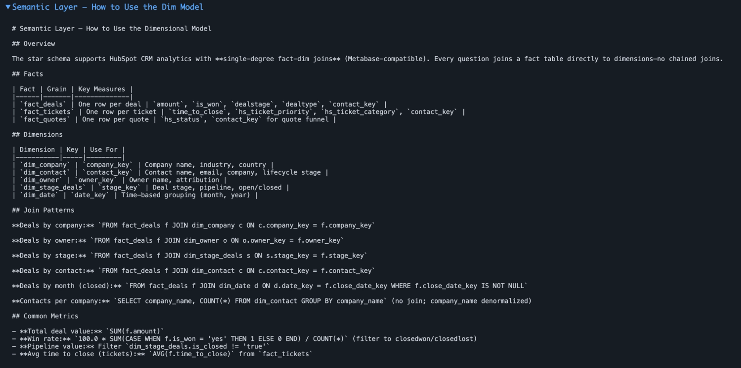 Note: The docs are “overfitted” to HubSpot. Because of having created this example with HubSpot, despite asking for generic examples, the model documented specific fact and dimension names in the modelling examples. This will bias towards reproducibility of this example, so I encourage you to try other pipelines and share findings. In my experiments with other pipelines, the process still works despite the “overfitting”. As with anything, you will still need to have back and forth with the LLM later for improvements.