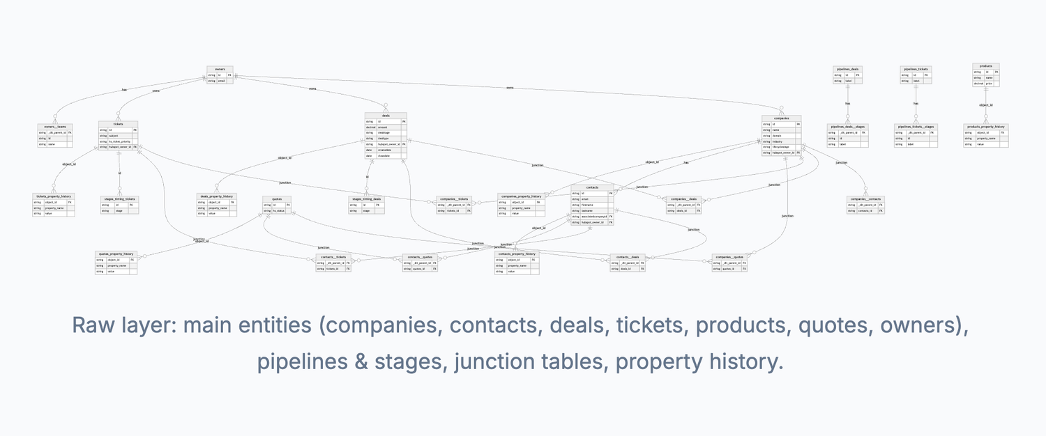 Tables as dlt loaded them: source-shaped, junction tables, and property history. No business logic. Main entities (companies, contacts, deals, tickets, products, quotes, owners), pipelines & stages, bridge tables for handling many-to-many relations, and property history.