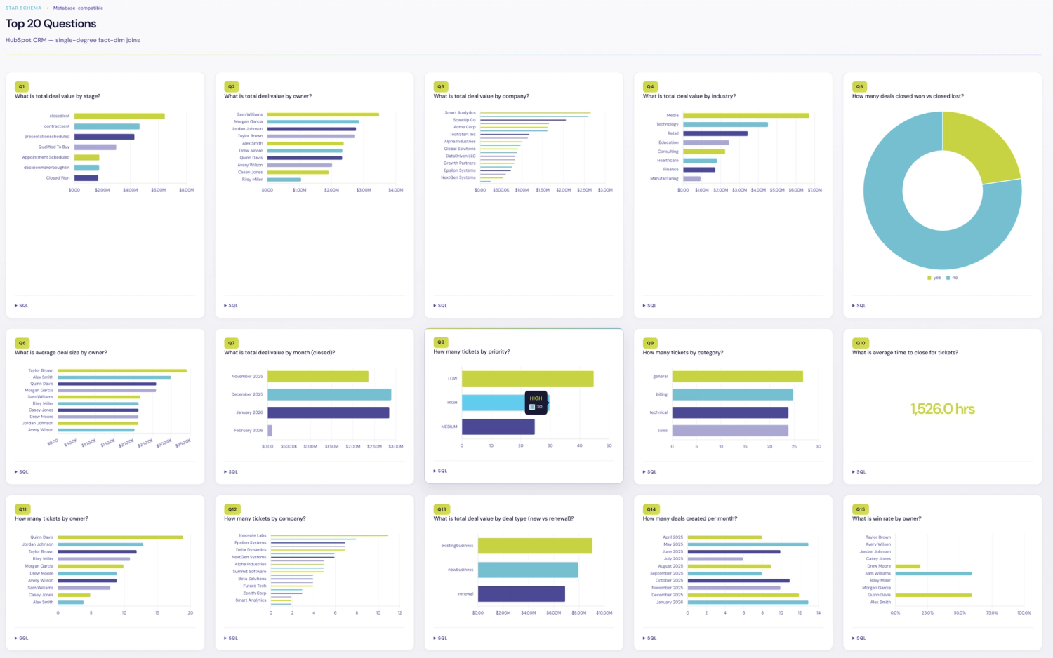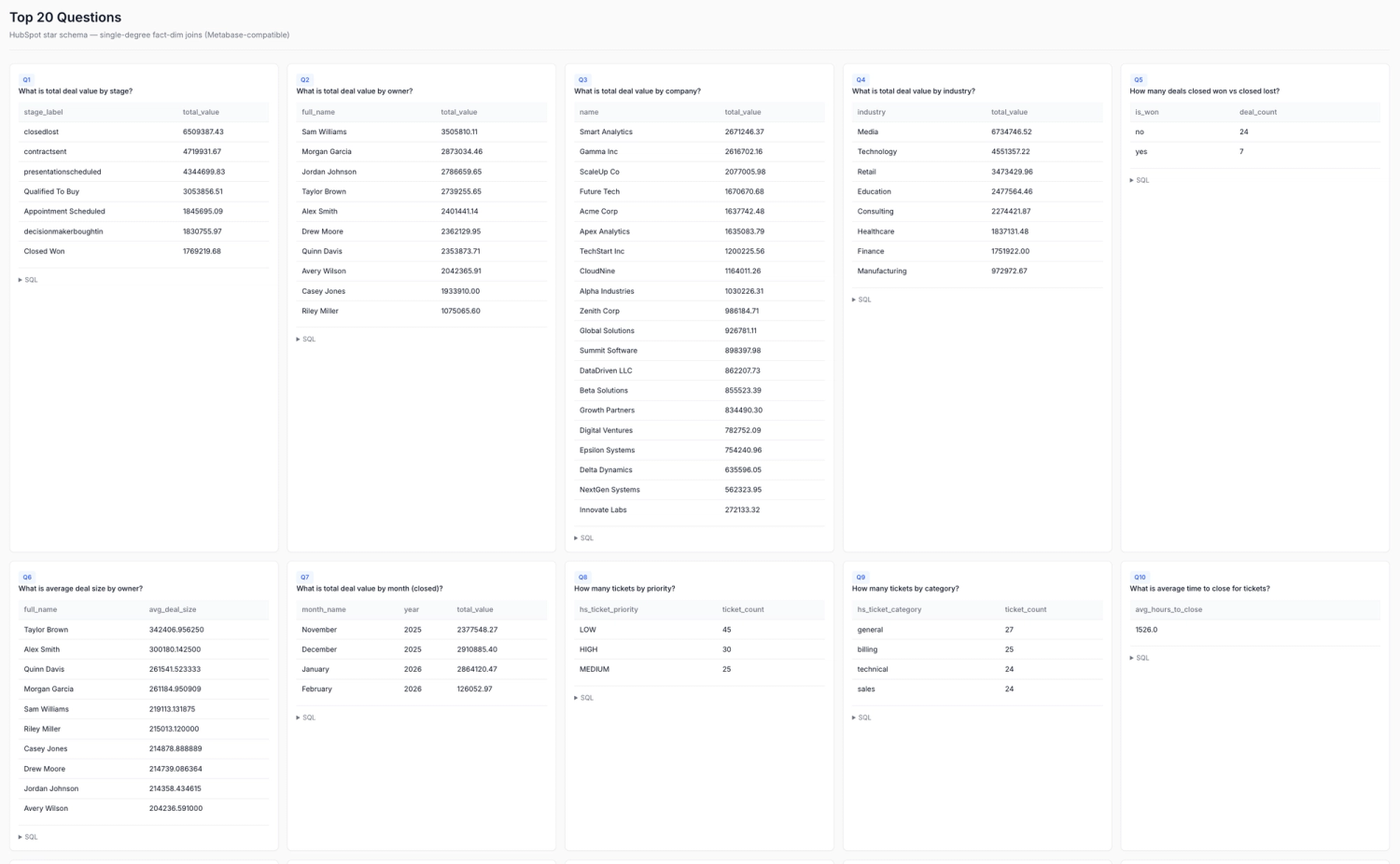 top20_dashboard.html renders each question with its SQL and the live result from DuckDB. Expand any card to see the SQL. The agent crossed the gap from raw to star in one session. You review. Done.