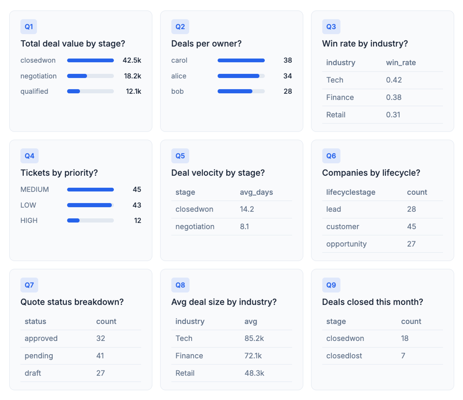 - Inspects the raw schema (companies, contacts, deals, junction tables like