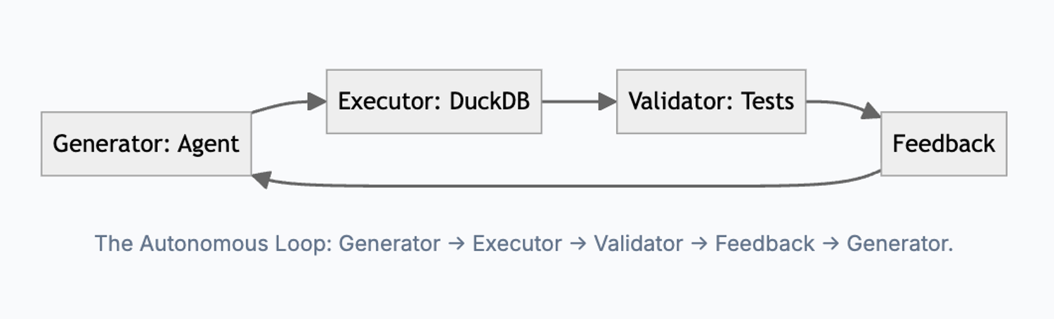 The leap to full autonomy happens the moment we replace human "review" with automated validation. If the agent generates a canonical model and we have end-to-end tests that validate the SQL against the actual data, the agent can self-correct and finish the job without a single prompt from you. We already do this implicitly during the "slop" phase: the agent generates a query, it fails, the agent sees the error, and it tries again until it works. Scaling that means the agent captures a request, proposes a plan, applies changes, and runs a battery of tests. If it passes, it deploys; if it fails, it loops back.