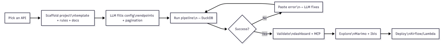 - IDE rules that teach your LLM about dlt (pagination, error patterns, config structure)