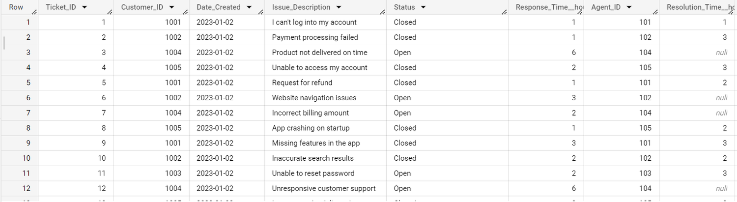 We then populated a BigQuery dataset with potential product usage data, such as: the status of the ticket (open or closed), response and resolution times, whether the ticket was escalated etc.