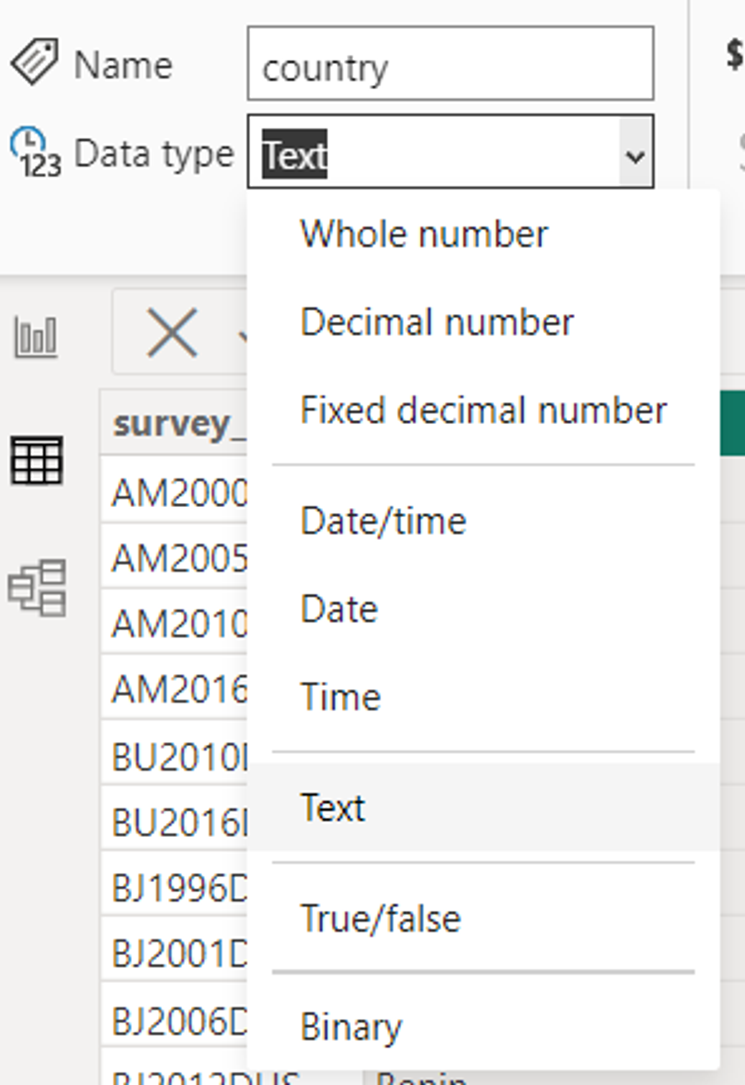 The column types as declared in Power BI in the first image here show that instead of saying double or int, it says Decimal and Whole number. We also have options for visualisation formats such as percentages or different datetime notations. It also has a binary type which is supported in the editor to enable conversion to friendlier types for the end user.