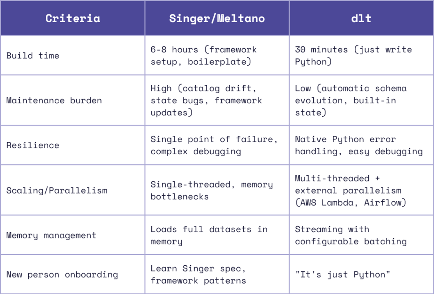 Singer loses on every dimension that matters to data teams. For someone who thinks in terms of Python, pandas, and SQL, dlt feels natural because it works the way pandas works, you import it, call its functions, and it handles the complex stuff behind the scenes without changing how you approach the problem.