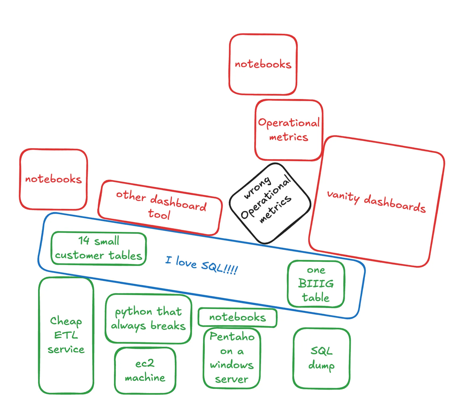 Rent a few connectors, slap some dbt on top, add tableau or something that doesn’t make you scream when working, and what do you have? A stack of blocks we give to analysts so they can feel like engineers without touching infra or code. A “safety over freedom” playground.