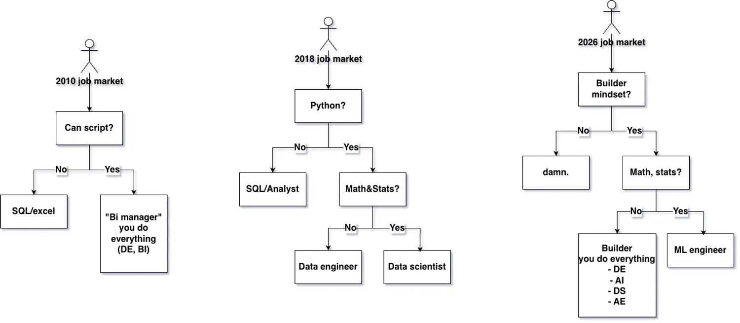 - 2018 (the great specialization): The "Modern Data Stack" era. We fractured into distinct roles: Data Engineers (python, infra), Data Scientists(python, stats), and Analysts (SQL/reporting). This was the era of the "Golden Path" and comfortable specialization.