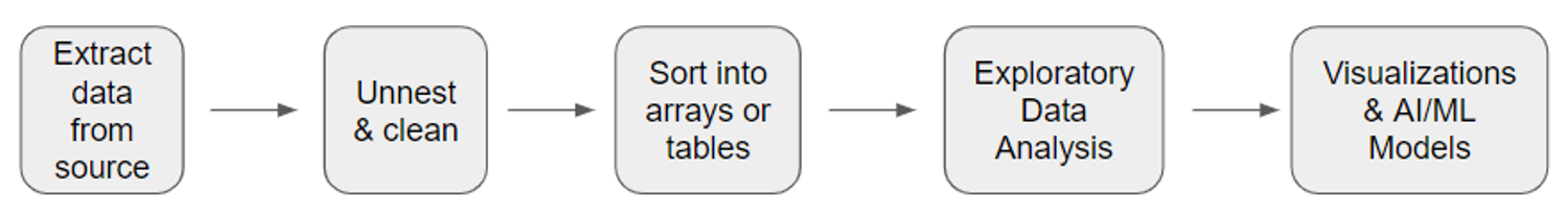from looking at the data: pandas successfully flattened dictionaries but did not unnest lists. Perhaps because in order to unpack these lists, one might need to create new tables, essentially create a data model entirely. But, that is something pandas does not do for us. So, to be able to use it, let’s flatten the data further into arrays and tables. Particularly, let’s pay attention to the amount of code required to achieve this task.
